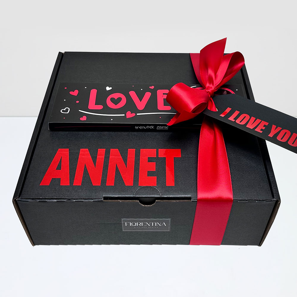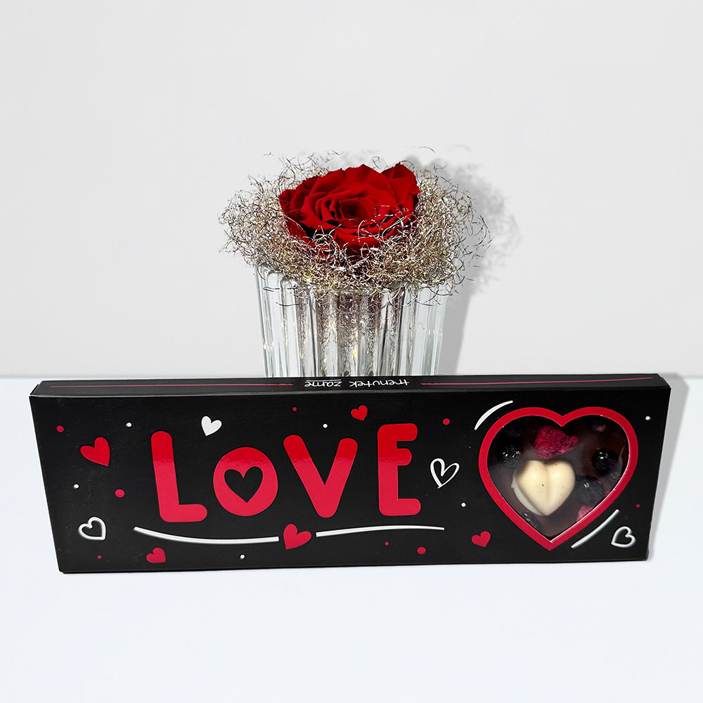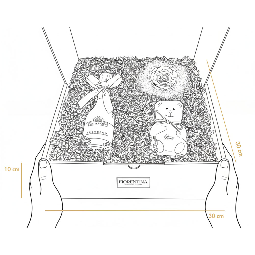 Nežni mehurčki italijanskega prosecca Villa Sandi v kozarcu prebujajo radost in praznični utrip, vsak požirek pa nosi sporočilo slavja in ljubezni. Ob njem se nasmehne čokoladni medvedek Lindt, majhen, a pomenljiv simbol skrbi, nežnosti in čustvene topline. Sladko razvajanje zaokroža čokolada Tete Fride s sporočilom Love, katere bogat okus in ljubek detajl srčka poudarita romantični značaj darila. Posebno mesto v paketu zavzema trajna rdeča vrtnica, večni simbol ljubezni, ki ostane kot dragocen spomin tudi takrat, ko trenutek že mine.