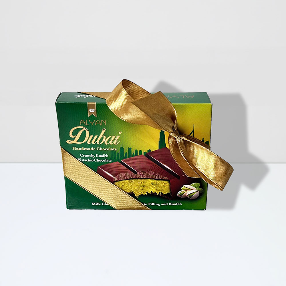 Dubajska čokolada je sestavljena iz mlečne čokolade in polnila s sladko pistacijevo kremo, umešano v drobno nasekljan kadaif. Mlečna čokolada s pistacijevim polnilom in kadaifom proizvajalca Alyan je razkošna poslastica, izdelana iz izbranih sestavin in kremaste teksture. Staljena sredica in vrhunske pistacije mu dajejo intenzivno aromo po oreščkih, zaradi česar je eleganten trendovski izdelek za poznavalce. Združuje edinstvene okuse in pusti nepozaben okus na ustih. Dubajska čokolada je vrsta čokolade, ki je polnjena s pistacijevo kremo in kadaifom (tanko narezanim testom, podobnim rezancem, značilnim za bližnjevzhodno kulinariko). V letu 2024 je zaslovela zaradi objav na družbenih omrežjih.