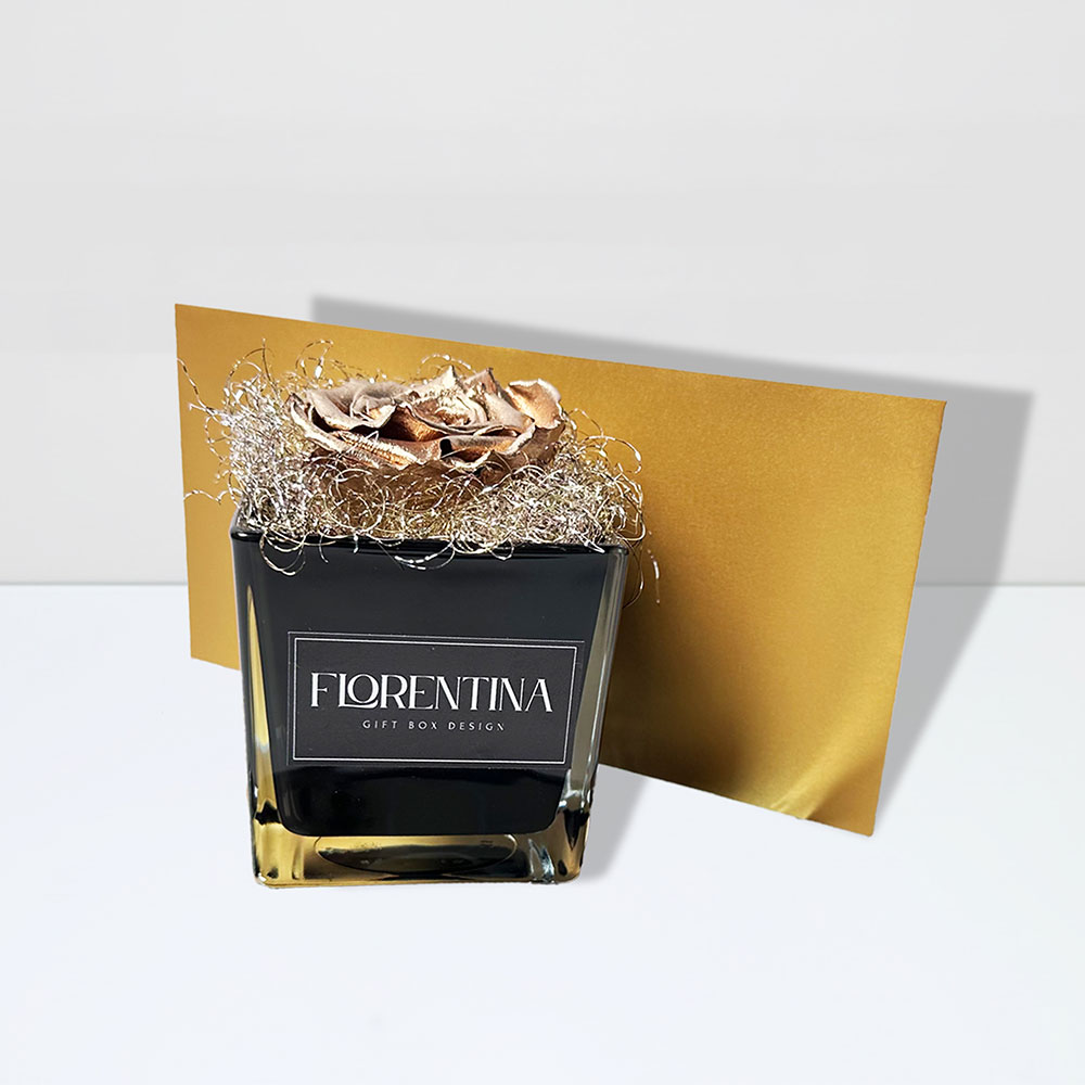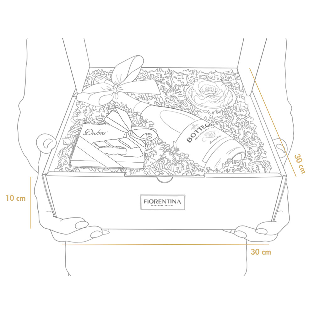 V kompletu vas pričaka viralna dubajska čokolada, priljubljena po svetu zaradi izjemne kombinacije hrustljavega kadaifa in bogate pistacijeve kreme. Gre za izdelek, ki je požel navdušenje na družbenih omrežjih in postal sinonim za orientalsko sladko razvajanje. Paket dopolnjuje brezalkoholno peneče vino Bottega Zero White, znano po svoji prefinjeni svežini in nežni aromi. Popolno je za praznovanja, poslovna obdarovanja ali trenutke, ko želite uživati brez alkohola, a z občutkom prestiža. Vse je elegantno postavljeno v personalizirano darilno embalažo Florentina, ki poskrbi za nepozabno predstavitev. Poseben dragocen detajl predstavlja zlata naravna in trajna vrtnica, simbol luksuza, večne lepote in iskrene pozornosti.