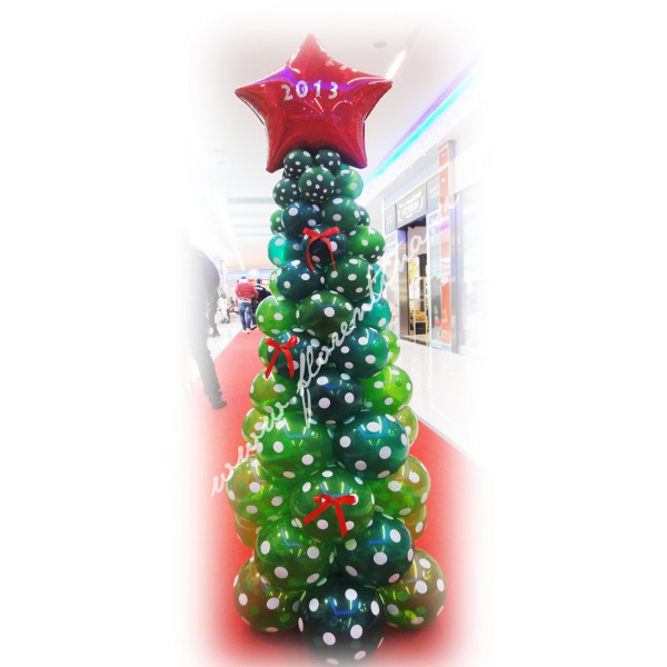 Polka dots smrekica je balonska dekoracija višine 175cm, sestavljena iz 60 balonov napihnjenih na različne dimenzije in pričvrščenih na stabilno kovinsko stojalo. Vrh balona je okrašen z rdečo zvezdo iz folije, ter nalepko 2013. Dekoracija lahko traja 14 -21 dni.