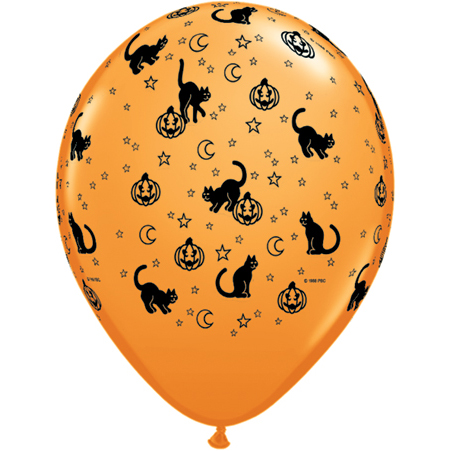 V kompletu je 5 potiskanih balonov s potiskom mačk in buč v oranžni barvi.