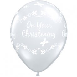 V kompletu je 5 potiskanih balonov z napisom On Your Christening v prozorni barvi.
