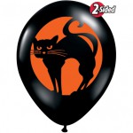 V kompletu je 5 potiskanih balonov s potiskom mačka v luni črni barvi.