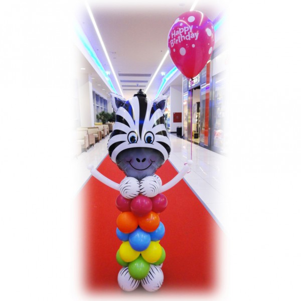 Baloni in balonska dekoracija v obliki vesele zebre. Je prekrasna centralna dekoracija za praznovanje rojstnega dneva, še posebej, ker je zebrasti vzorec kar precej v modi. Pisani balončki so med seboj spleteni in napihani na zrak, glava zebre pa je napolnjena na helij. Balonski stebriček stoji sam, brez posebnega stojala. Zebra drži v roki balon happy birthday.