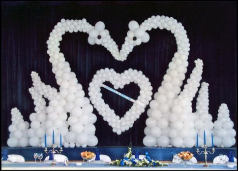 Ekskluzivna dekoracija zaljubljena laboda dimenzije približno 15 x 4 metre lahko postavimo v velik prostor in na ta način naredimo krasno ozadje v poročni dvorani. Laboda sta pletena iz balonov različnih velikosti, kateri so vpeti na lahkotno vendar čvrsto aluminijasto samostoječe ogrodje. Na sredini labodov je obešeno poročno srce z trakom na katerem sta imena mladoporočencev.
