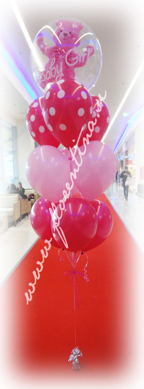 Dobrodošla deklica Anastasija. Prisrčen kupček balončkov prinaša radost v dom novorojene deklice in splošno veselje presrečne družine. Prikupen medvedek je balon, ki je zapakiran v balon in napolnjen s helijem. Baloni so v treh barvnih kombinacijah: roza, malinova barva in potiskani z veliki belimi pikami. Šopek je samostoječ, višina pa se lahko izdela po naročilu.