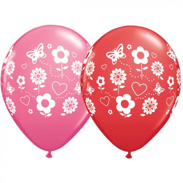 V kompletu je 5 potiskanih balonov v rdeči in roza barvi.