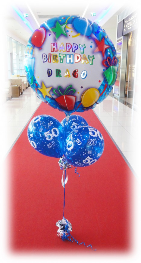 Šopek dopolnjujemo z večjimi lateks baloni kot običajno s smile obrazom, napisom Happy Birthday ter številko 50. Baloni so zapakirani v prozorne mehurčke. Na ta način prav dolgo ostanejo kristalno svetleči. Na prinešeno darilo ali našega izbranega medvedka Me To You vam lahko izdelamo enako pentljo s potiskanimi smile obrazi. Dekoracijo vam lahko izdelamo v različnih višinah kot namizno ali talno dekoracijo ali kot dekoracijo darila.